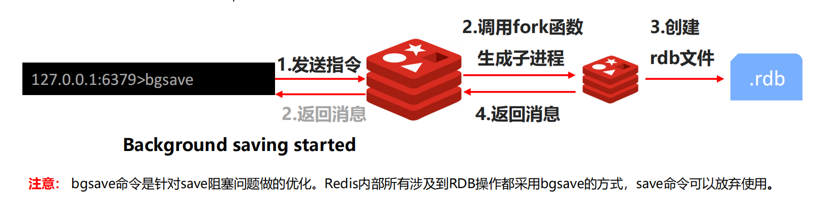 当执行bgsave的时候,客户端发出bgsave指令给到redis服务器。注意,这个时候服务器马上回一个结果告诉客户端后台已经开始了,与此同时它会创建一个子进程,使用Linux的fork函数创建一个子进程,让这个子进程去执行save相关的操作,此时我们可以想一下,我们主进程一直在处理指令,而子进程在执行后台的保存,它会不会干扰到主进程的执行吗?